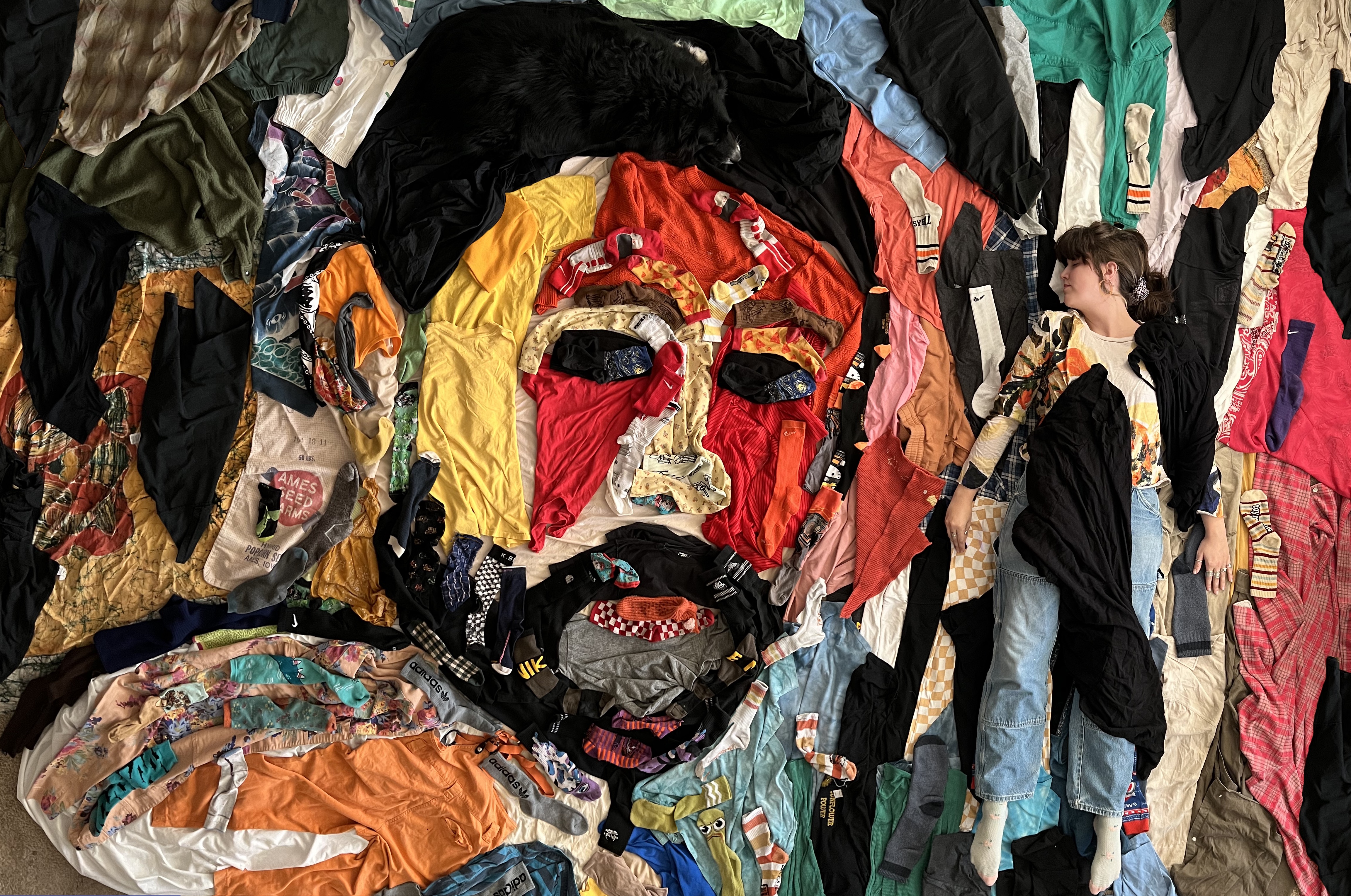 Am liebsten nenne ich das, was ich tue, "Malen mit Kleidung". Das beschreibt exakt das, was ich tue. Aber wenn ich ein Projekt, an dem ich gearbeitet habe, auf Instagram poste, nenne ich das "Faserkunst", ein Ausdruck, von dem ich denke, dass ihn die meisten Menschen verstehen können. Jetzt, wo ich meinen Lege-Prozess auch aufnehme, ist das quasi eine Kunstform an sich, Videokunst. Und das Video wiederum zeigt eine Art Performance, in der ich das Werk herstelle. Aber falls jemand fragt, würde ich es lieben, wenn man es Malen mit Kleidung nennen würde. Ich fühle mich sehr von den Impressionisten und dem Fauvismus angezogen, die Ära von Van Gogh und Matisse, die die Farbe nutzten. Ich mag ihre breiten Pinselstiche, denn ich sehe in ihnen bestimmte Kleidungsstücke, etwa eine ganz bestimmte Socke. Und wenn ich die lege, fühlt es sich an, als würde ich einen Pinselstrich malen.