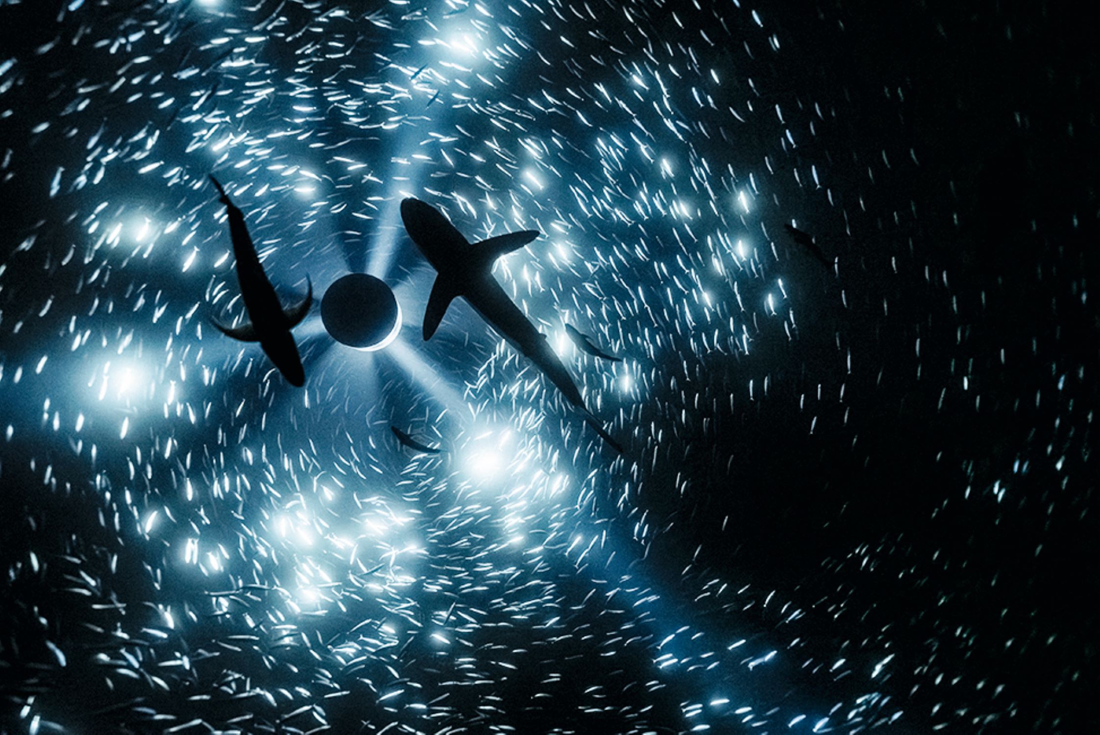Im ersten Raum der Ausstellung entführt er uns mit "Where Waters Meet" (2019) in die Tiefen mexikanischer Cenoten, in denen er Freitaucher wie Embryonen bei ihren Tauchgängen fotografiert hat. Begleitet von verstärkten Unterwassergeräuschen und in einem stark abgedunkelten Raum scheinen die Fotographien sich fast zu bewegen, und der Boden unter den eigenen Füßen beginnt beim Anblick dieser freischwebenden, nackten Körper zu schwanken. "Ich wollte, dass man in dieser Ausstellung das Meer wirklich spüren kann und sich auch vom eigenen Selbst lösen kann – vielleicht eine Annäherung an das von Freud entwickelte Konzept des 'ozeanischen Gefühls', das ich selbst auch bei meinen ersten Tauchgängen empfunden habe. Ein Gefühl der unmittelbaren Verbundenheit mit deiner Umgebung, die wir oberhalb der Wasseroberfläche durch andere Kommunikationsweisen ersetzt haben."