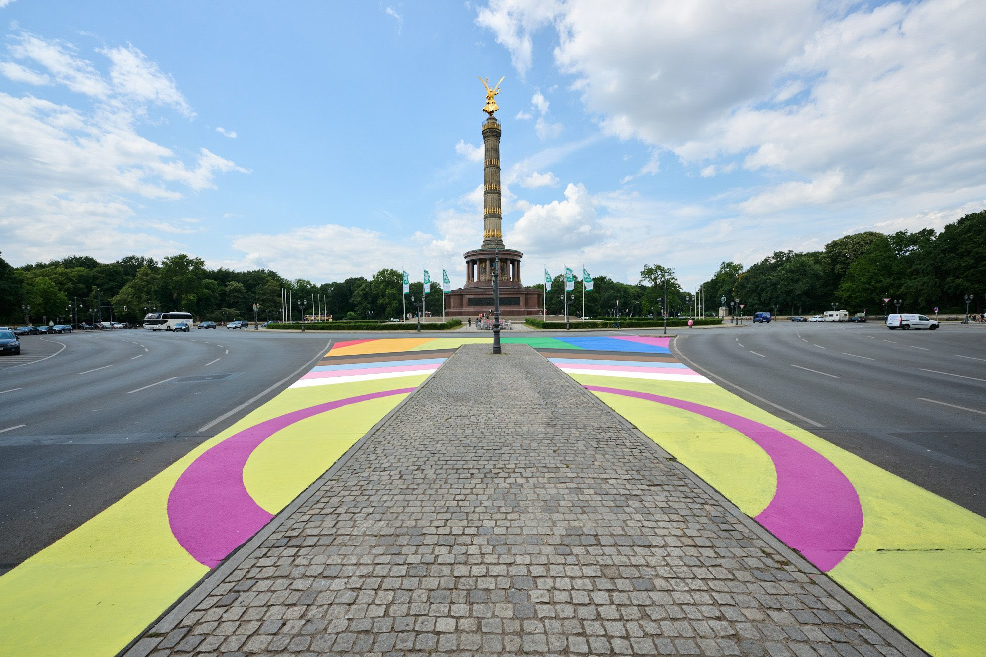 Passend zum anstehenden Christopher Street Day (CSD) gestaltet Kulturprojekte Berlin mit Unterstützung des Bezirksamts Mitte eine Progress Pride Flag rund um die Siegessäule. Dieses Motiv erweitert die "klassischen" Regenbogen-Farben um weitere Töne, um explizit queere People of Color und trans Menschen mit einzuschließen. "Wir sind dankbar, dass wir an so einem markanten Ort erneut das so wichtige Zeichen für Vielfalt und Toleranz und damit die kulturelle Vielfalt in Berlin setzen können", sagt Moritz von Dülmen, Geschäftsführer von Kulturprojekte Berlin, in einer Mitteilung.